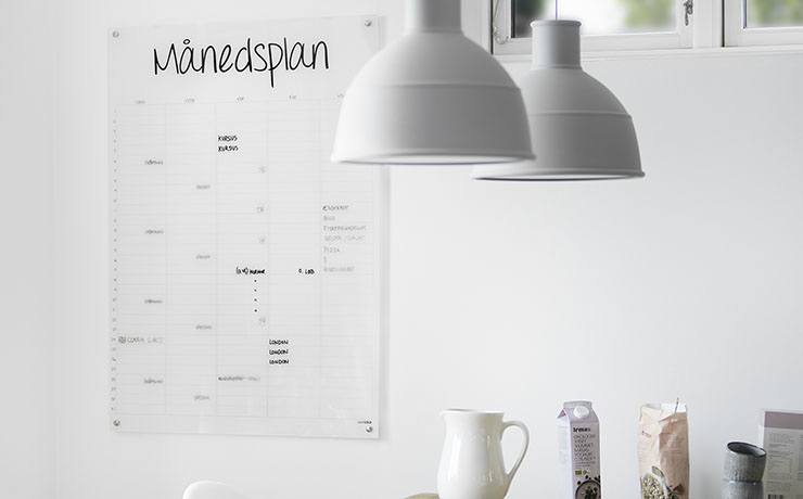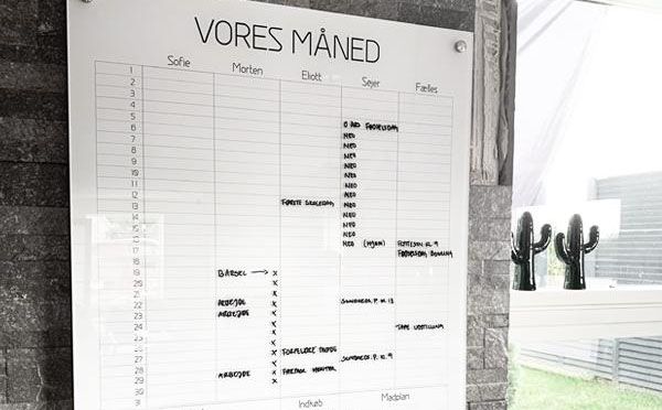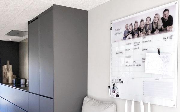 Du skriver på kalenderen med whiteboard tusch, som nemt viskes ud.